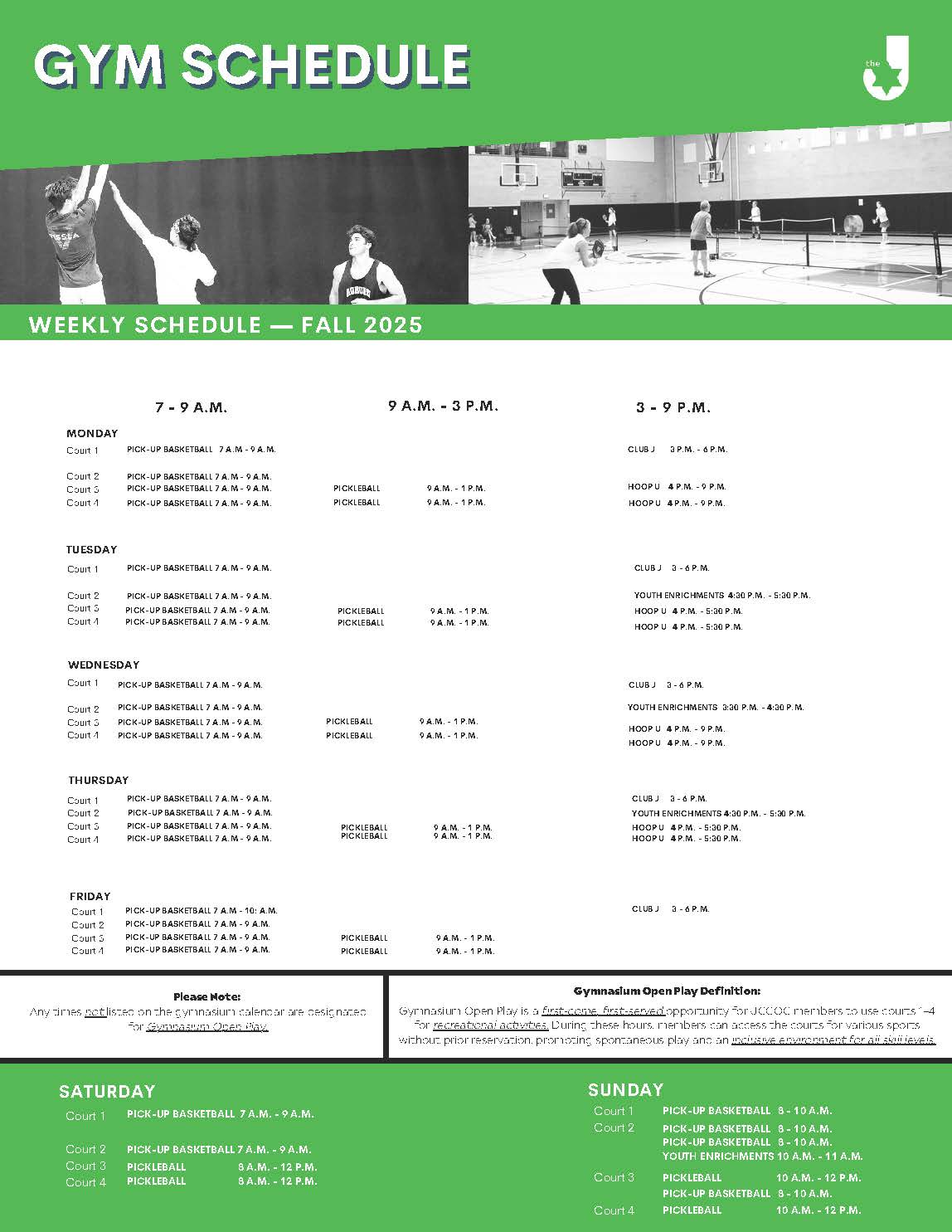 Our state-of-the-art facility features one of the largest JCC gymnasiums in North America, with four regulation basketball courts, and volleyball courts. You can also play on our large sports field and enjoy our top-of-the-line equipment.